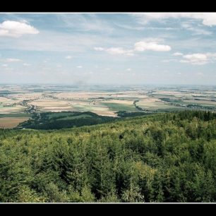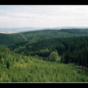 Posledních 170 výškových metrů ze sedla a jsme u rozcestníku Borůvková hora ve výšce 899 m, k němuž se zleva připojuje modrá značka z Travné. Svému názvu se hora rozhodně nezpronevěřuje, neboť tu v létě skutečně nebývá o borůvky nouze. Na Z rozhledny na Borůvkové hoře si pak můžeme užít náramné výhledy až do Polska. Hřeben Borůvkové hory tvoří státní hranici s Polskem, kterou červená značka spolu s polskou zelenou kopíruje při sestupu do tři kilometry vzdáleného sedla Růženec (600m.n.m). Až do odsunu sudetských Němců po r.1945 stávala v těchto místech osada Rosenkranz s několika zemědělskými usedlostmi a poutním kostelem, těsně při hranici pak i hostinec, jak je patrno ze starých pohlednic z té doby. Na místě se už mnoho stop po dřívějším osídlení nevyskytuje; snad jen místy nepatrné zbytky základů, ztracených v trávě či skupinky zplanělých ovocných stromů při cestě dosvědčují, že tu kdysi žil člověk.