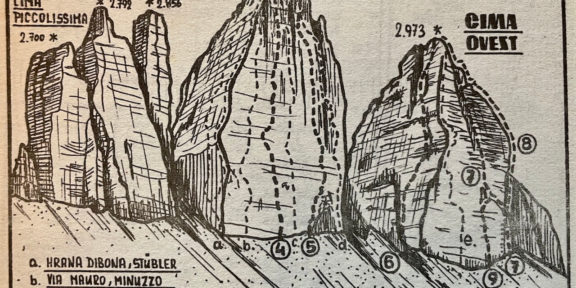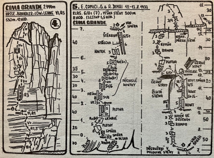 Vícedélkové cesty v horách bývají zachyceny méně detailně, často je nákres opravdu schematický. Rozhodně by neměly chybět informace o doporučené délce lana pro výstup i slanění, předpokládaná časová náročnost cesty (nástup/lezení/sestup) a doporučený sortiment pro jištění (expresky/vklíněnce/friendy).