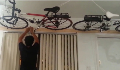 Se zajímavým nápadem, aspoň v mých očích, přišel mladík na videu, který kolo pověsil díky kladce pod strop. Jenže ne s koly kolmo ke stropu, ani zavěšení kola tak, aby bylo volně v prostoru. U jeho varianty je kolo pod stropem, ale jakoby „jede“ po jedné ze stěn. Slovy to zní docela kostrbatě. Fotka níže vám jeho metodu určitě přiblíží lépe.