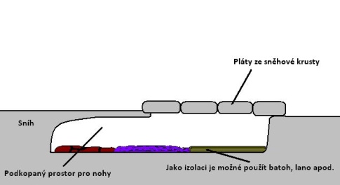 Načrtnutý obdélník vyhlubte asi o půl metru a na jedné straně podkopejte prostor pro nohy, ale tak, aby se v tomto místě „strop“ nezřítil. Myslete také na zbudování bočních okrajů, na kterých budou sněhové pláty ležet. Zjednodušením může být vytvoření sněhových plátů z jiného místa, než budete hloubit bivak. Tímto vám odpadnou problémy s přesahy, protože si pláty jednoduše uděláte širší, než je šířka hloubeného prostoru.
