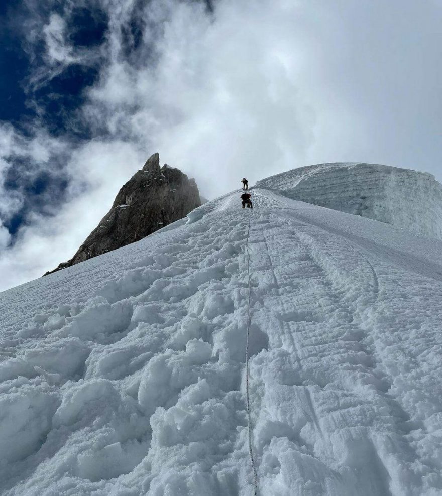 C3 je v 7000 metrech a vrcholový den je tím pádem hodně dlouhý. Vstávali jsme o půlnoci a kolem jedné jsme měli vycházet. Byla jsem dřív oblečená a při čekání před stanem se do mě dala zima, tak jsem vyrazila napřed. V ten den mířilo ale na vrchol více lidí, takže jsem před sebou na skalnatém hřebínku viděla hada čelovek, přede mnou stoupali kluci z Brna a věděla jsem, že Marek půjde kousek za mnou. Na ten hřebínek navazuje poměrně nekonečný traverz, technicky to byl naprosto jednoduchý terén, ale s tou rostoucí nadmořskou výškou ubývá psychických sil, a to bylo místo, které hodně lidí i odradilo a otáčeli se. Asi v 7800 m se dojde do sedla, ze kterého se otevře strmější vrcholová stěna. Potkala jsem tam kamaráda Jošku z brněnské party a nahoru už jsme lezli spolu. Bylo to celkem srandovní, protože jsme lezli doslova po čtyřech jak batolata a co chvíli se vydýchávali. Samotný závěr cesty vede po krátkém, ale exponovaném hřebínku. S Joškou jsme byli i spolu na vrcholu, takže jsem tu radost měla s kým sdílet. Udělali jsme pár fotek a pelášili jsme dolů.