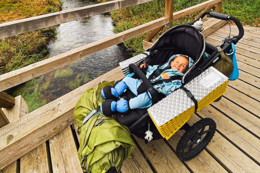 Přípravy začaly už pár měsíců předem. Ben a já jsme se seznamovali společně se stanem všude možně, v obýváku, na zahradě, jen abych alespoň trochu věděla, že tohle na cestě pak překážka nebude. A vyplatilo se. Před naší velkou cestou jsme absolvovali společně i jeden delší přechod – Stezku údolím Lužnice. Díky tomu jsem zjistila přibližné množství věcí, které u sebe bude potřeba mít. A i to, že je důležité, jestli jsem na to připravená fyzicky. Kočárek totiž uveze hodně věcí, ale je potřeba počítat s tím, že ho do těch kopců musím dokázat vytáhnout. Takže jsem se snažila šetřit gramy i tentokrát. Veškeré vybavení jsem si ladila podle sebe, spoléhala jsem jen na to, co už máme předem vyzkoušené a čemu 100% věřím.