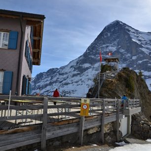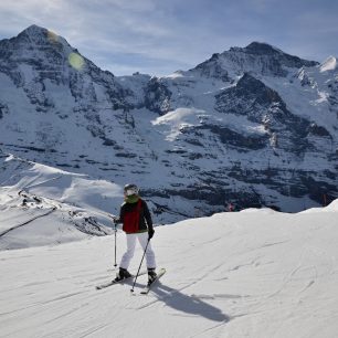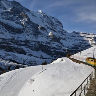 Jakmile v pozdějších hodinách slunce ozáří i svahy pod obávanou severní stěnou Eigeru, vydáváme se nahoru lanovkou s příznačným jménem Eigernordwand. Ledovec na úpatí hory se modře leskne a odhaluje svou vrásčitou tvář plnou puklin. Červená sjezdovka odsud je celkem úzká, kocháme se ale výhledem na horský vlak, jehož trasu dokonce podjíždíme v samém závěru sjezdu úzkým tunelem.