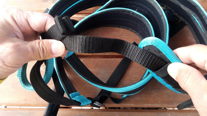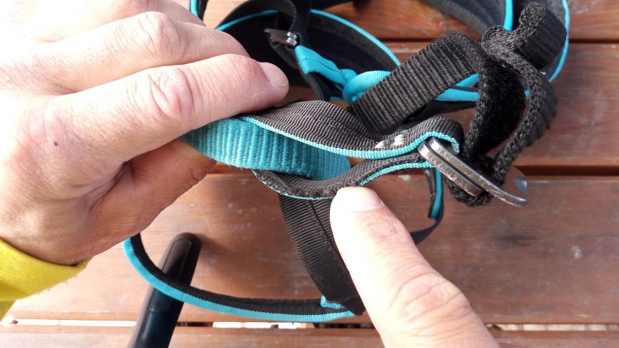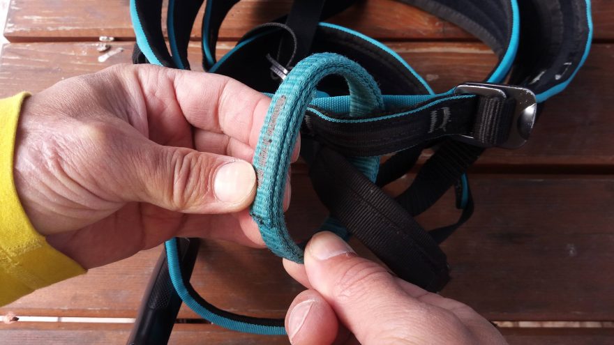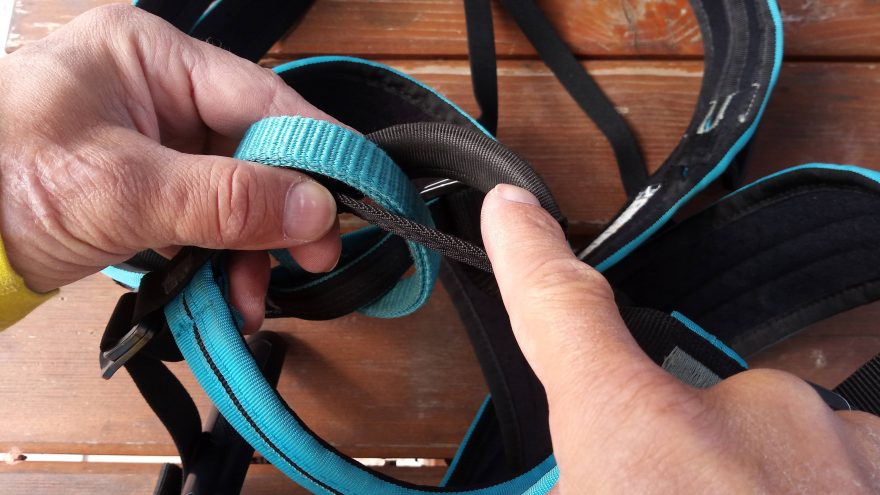 Sledujeme mechanické poškození u částí, které mají vliv na bezpečnost. Zaměříme se především na jistící oko, navazovací body, spony a pevnostní popruhy. Hledáme vypáraná vlákna, naseknutí, prodření nebo nezvykle měkká či tvrdá místa. Vyzkoušejte i plynulý chod popruhu ve sponách a případně si všímejte i poškození spony. Při kontrole si musíme být dále jisti, že náš úvazek nepřišel během používání nebo skladování do styku s chemikáliemi.