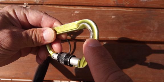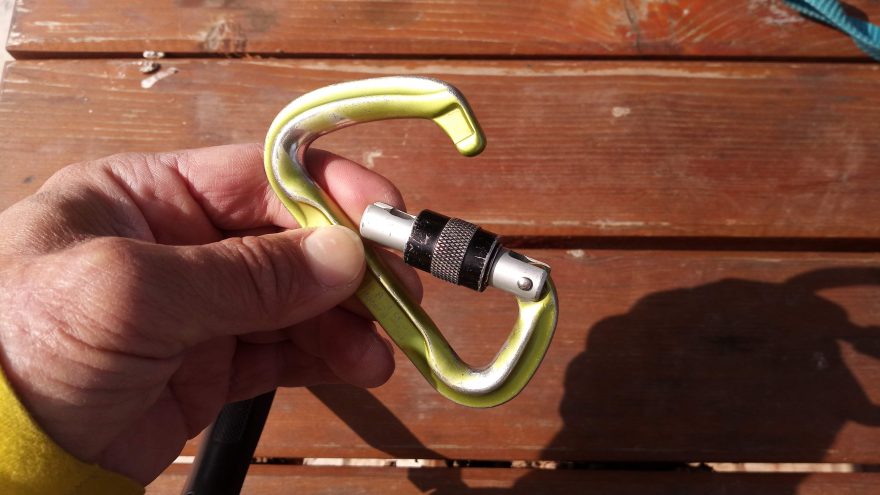 Jsou z oceli, duralu nebo z podobných odolných kovových materiálů, takže jejichž životnost je při správném používání prakticky neomezená. U karabin se zaměřme především na opotřebení a prodření zvláště v místě kudy prochází lano. Probroušené karabin vyřadíme. Západka by měla chodit plynule a nijak se nezasekávat. Třeba o tom víte a vždycky při lezení ji dovřete rukou…a pak jednou zapomenete. Ups! Pojistka zámku by měla chodit též volně a držet karabinu zajištěnou a to u všech typů pojistek.
