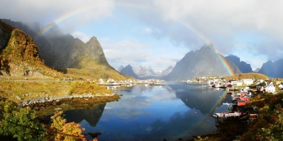Vesnička Reine je podivuhodné místo, které hostí skrumáž dřevěných domů přesně zapadajících do okolí. Je neuvěřitelně fotogenická, a když se nad městem rozzáří duha, je to pohled pro bohy. Chceme vylézt na kopec Reinebringen (448 m) nad vesnicí, ale nevíme odkud. Noři si totiž se značením treků a stezek hlavu moc nelámou a najít začátek nebo i pokračování je občas téměř nemožné. Navíc se tu na Lofotech snaží přírodu chránit právě tím, že spoustu tras raději vůbec neznačí. Kdo opravdu chce, ten si poradí sám.