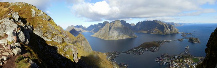 V obchodě prostudujeme mapu, zhruba zjistíme, odkud jít a vydáme se na cestu. Na parkovišti tu stojí i jeden Němec, se kterým se dáme do řeči. Na rozdíl od nás má v mobilu internet a ukazuje nám trasu. „Taky se tam chystám, je to prý jeden z top zážitků z Lofot,“ povídá nám Hans. Vyrážíme tedy na cestu. Je to docela krpál, skoro 450 metrů převýšení a jsme nahoře. Opravdu top zážitek! Široký rozhled na mořské zátoky a nad nimi se tyčící srázy hor jsou jedinečné!