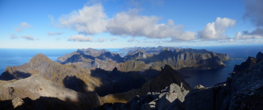 Překonáváme finální výstup balvanovým bludištěm a konečně se ocitáme na vytouženém vrcholu, 1029 metrů vysoko. Bylo to náročné, ale stálo to za to! Člověk si tu připadá skoro jako bůh, krajina pod ním jako na dlani. Všude kolem jen nekonečné horské vrcholy Lofot zasazené v modrém moři, až dokud obzor konečně nezačne mizet v dálce.