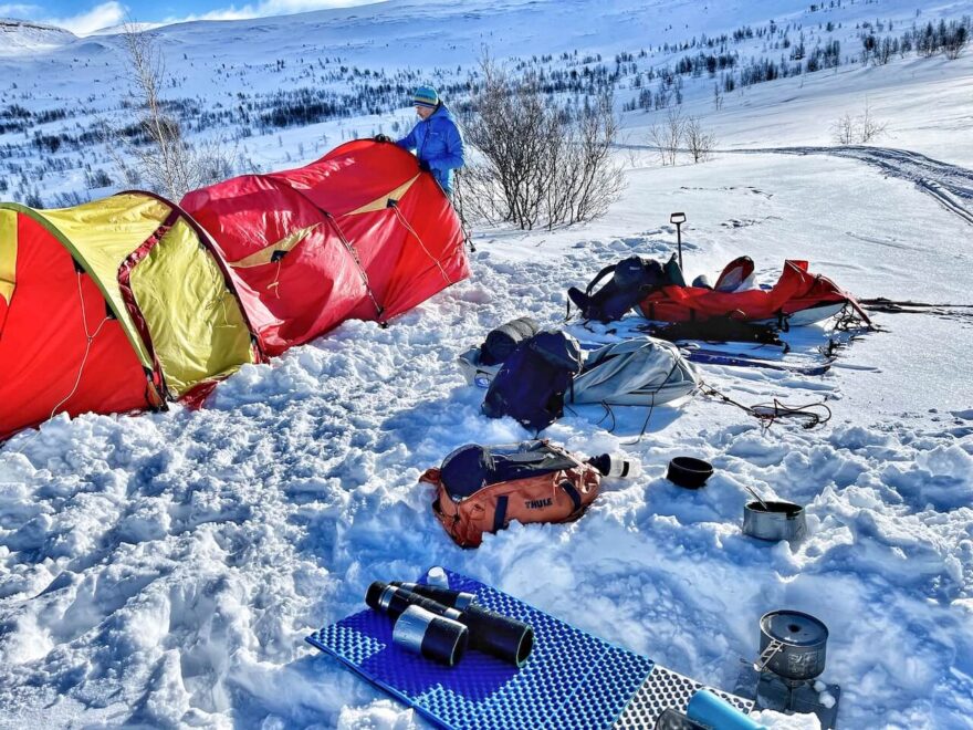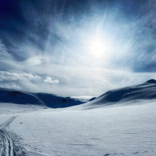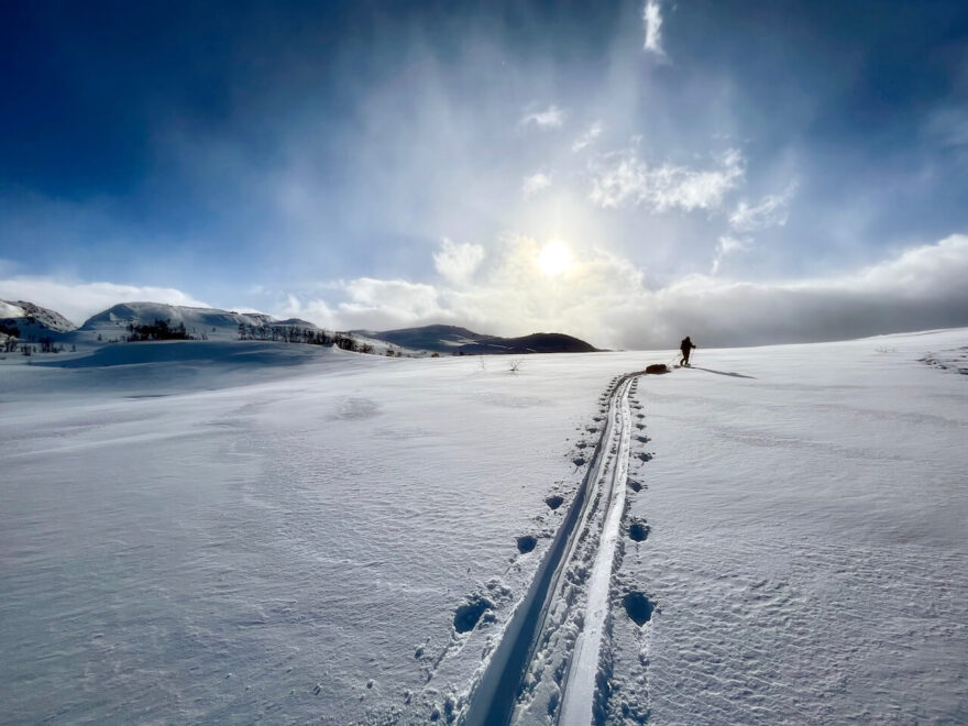 Čeká nás první výlet na Hardangerviddě. Máme pět dnů, než se budeme přesouvat do Geila, kde máme sraz s kamarády. Boby jsou zabalené a připravené v kufru. Sedíme na předních sedačkách, venku řádí silný vítr a my se nemůžeme odhodlat vystoupit a vyrazit. Opět mám ten zvláštní nervózní pocit. Máme všechno? Jsme v kondici? Nepodcenili jsme nic? Kontrolujeme boby, zapínáme se do tažného postroje a obouváme lyže. Vítr po pár kilometrech ustává a nervozita se mění v euforii. Jsme opět na cestě zasněženou panenskou krajinou a spoléháme se jen sami na sebe. Během těch pár dní nám automaticky nabíhá rutina, kterou jsme si vytvořili loni při 450kilometrovém přechodu Kungsleden. Každý máme svoji roli a není potřeba diskutovat o tom, co má kdo udělat.