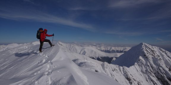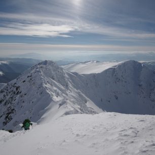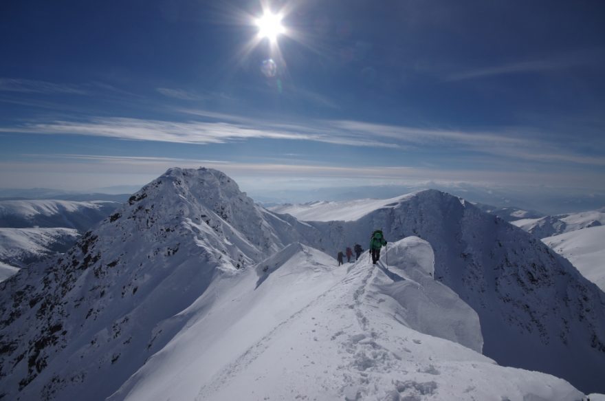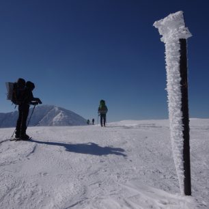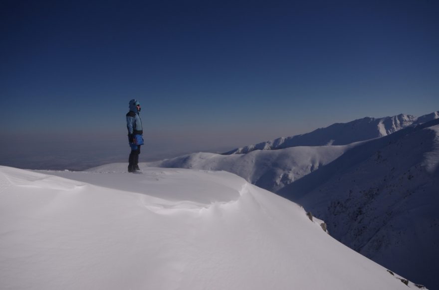 Tři namalované grafické symboly potkáváme jen na prvním stromu u chaty a další až za několik dní. Prošlapaná stopa tady taky kupodivu není. Co tady ještě není? Krom dalších lidí taky třebas horská služba, signál anebo lavinová předpověď. Máme v podstatě tři možnosti – dvojka, trojka nebo čtverka. Vystoupali jsme na hřeben. Chůze na sněžnicích je náročná, stoupání je tak na hraně příjemnosti. Chůze bez sněžnic je nemožná, boříte se po kolena ve sněhu. Na skialpy ten terén taky není. Jakmile začne zacházet slunce, počet vrstev na mém těle se dostává na dvouciferné číslo. Peří se stává nejlepším přítelem člověka.