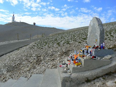 Na vrcholu však po tom příběhu nenacházím ani stopy. Na přesné místo Tomyho skonu se musím přeptat. „Jasně že vím, kdo je Tom Simpson,“ odpovídá až skoro dotčeně jeden z místních borců. „Je to na východní straně. Pojeď za mnou, ukážu ti to.“ Sjedeme spolu asi dva kilometry pokreslené silnice a pak pokyne rukou do svahu nad námi. Na žulové desce se vyjímá silueta cyklisty, na schůdcích pod ní se tísní pestrobarevná sbírka bidonů, přívěšků a cyklodresů – upomínkových předmětů, zanechaných k uctění Tomyho památky. Poutní místo cyklistů.
