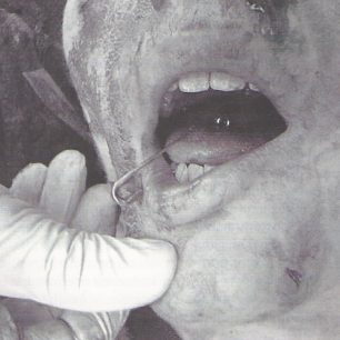 Bylo tedy doporučováno sáhnout postiženému do úst, nejlépe rukou v kapesníku, špičku jazyka vytáhnout a špendlíkem zachytit po straně ke tváři. Jak příšerně to vypadalo si můžete prohlédnout na následujícím obrázku – bohužel je reálný, pořízený v pitevně.
