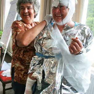 - Naučíte se pracovat se zdravotnickým materiálem. Budete opravdu používat obvazy, rukavice, lepenku. Když to uvážete blbě, opravdu to nebude držet. A bude to dál krvácet.