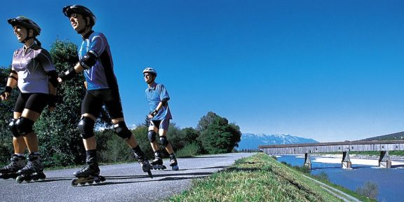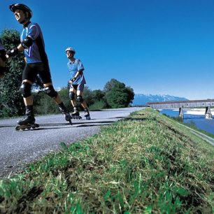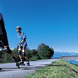 Svobodněji než na kole a rychleji než pěšky projíždíme na in-linech po hladkém asfaltu předalpskou krajinou z lázní Bad Ragaz přes Lichtenštejnsko podél řeky Rýn.