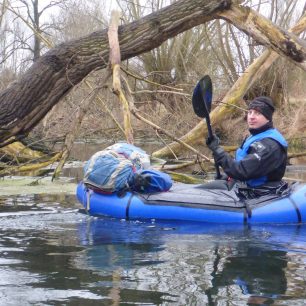 Přejít do galerieMáme dnes v nohách 40 kilometrů náročným terénem. Meleme z posledního. Chodidla pálí, ztuhlé svaly na nohou bolí a tupě opakují automatické pohyby. Konečně se z hustého houští vynoříme na oblázkovém břehu řeky. Z batohu každý vytáhneme válec o velikosti sbaleného stanu a dáme se do nafukování našich člunů pomocí lehkého nafukovacího pytle, kterým vtlačujeme vzduch do komory. Zbytek dofoukneme ústy speciálním pístem. Oblečeme vesty, složíme pádla, zabalíme krosny a jejich obsah do odpadkových pytlů. Celá procedura netrvá déle než deset minut a už sedíme na řece. Unavené nohy si užívají slastného odpočinku. Mění si směnu s odpočatýma rukama. Technicky nenáročná voda se silným proudem nás veze zadarmo a bez námahy. Kocháme se úžasnou krajinou a vychutnáváme si zase úplně jinou perspektivu cestování krajinou. Kolem řeky potkáváme spoustu zvířat – včetně orlů bělohlavých, losů a jednoho velkého grizzlyho. Pohybujeme se dvakrát až třikrát rychleji než na souši. Díky packraftům ještě do setmění uděláme dalších 30 kilometrů po řece.
