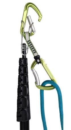 Hliníková teleskopická výsuvná tyč složená ze 7 dílů. Nerezová pružina drží otevřenou karabinu s expreskou, kterou uvolní po cvaknutí borháku.