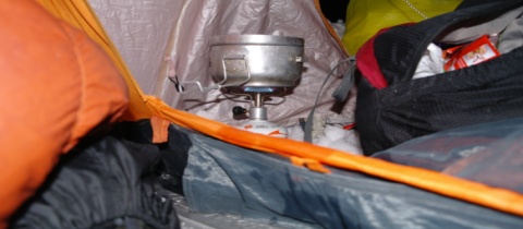 – Pokud vaříte v zimních podmínkách a stan je na sněhu, tak si přes podlážku uplácejte dobrou plošinku pro vařič. Někdy se totiž stane, že se plocha pod vařičem vlivem tepla trochu změní a už může být průšvih v podobě mokrého spacáku. Pokud ve stanu nemám dostatečně rovný terén a je poblíž dobrý placák, tak ho na chvíli pozvu do stanu, aby posloužil jako podložka.