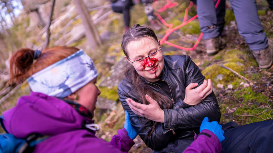 Některé simulace jsou inspirované skutečnými příběhy. Zachraňujeme turisty s otřesem mozku v rumunských horách, zasahujeme u autonehody, děláme z karimatek improvizované dlahy a z lana nosítka, učíme se o alergiích a popáleninách. Poprvé používám v praxi automatizovaný externí defibrilátor (AED), sestavujeme si vlastní expediční lékárničku, v rukavicích tlačíme prsty do rány a zastavujeme masivní krvácení. Je to dril od rána do večera a lektoři maskovaní falešnou krví nás nešetří. Hrají hysterické zraněné a snaží se nám simulace co nejvíc přiblížit reálu.