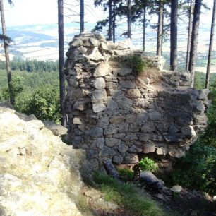 Pohodlnou cestou kráčíme asi půl kilometru a pak uvidíme významovou odbočku vlevo vedoucí na hrad Střílky. Po zhruba 300 m překročíme bývalý hradní příkop a vyšplháme se ke zbytkům hradních zdí, odkud je překvapivě pěkný výhled severním směrem. Stručnou historii hradu si můžeme přečíst na informačním panelu nově zřízené naučné stezky Příroda a okolí Střílek. Stejnou cestou se vrátíme zpět na modrou turistickou značku, s ní pokračujeme pěkným bukovým lesem, projdeme sedlem mezi Velkou a Malou Jivinou (519 a 517 m), pak se stočíme mírně vlevo a klesáme k silně frekventované silnici E50. Tu musíme s velkou opatrností přejít. Na druhé straně je oblíbený motorest Samota, u kterého bylo po jeho rekonstrukci vybudováno i poměrně velké hřiště pro děti.