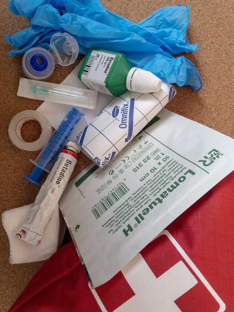 Základní vybavení k ošetření ran: – stříkačka – jehla/ pinzeta – desinfekce – mastný tyl (nebo Betadine mast) – gázové čtverce – perforovaná náplast – náplast z netkané textilie |