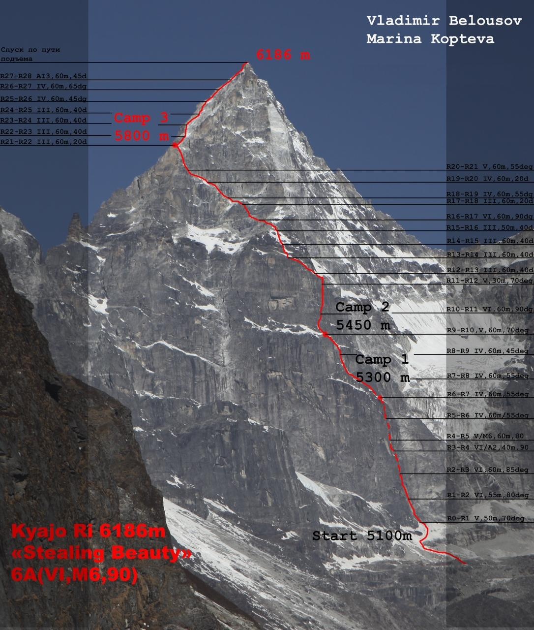 Opět šlo o malý horolezecký tým, který čítal pouze dvě osoby – Rusa Vladimíra Belousova a Ukrajinku Marii Koptevovou. Svůj výstup na Kyajo Ri vedli extrémně strmou východní stěnou. Zabral jim šest dní (pět dnů na vrchol + 1 den sestup) a byl proveden v alpském stylu. Cesta se skládá z 28 délek, z nichž kritické a zároveň stěžejní byly ty, ve výšce 5100 – 5600 metrů. Linie dostala název „Stealing Beauty“ a byla ohodnocena za 6A podle ruské škály (M6, 90°, zhruba VI UIAA).
