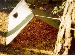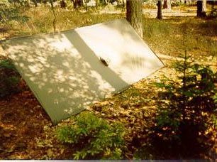 Další poměrně zajímavou možností jak také lze využít rozpínací pončo na bivakování je, například v neschůdném nebo třeba v hodně mokrém terénu, spát v závěsné síti (hamace) a nad ní zavěšeným pončem, či celtou se zakrýt. Při uvazování sítě platí, že tu stranu kde budeme mít hlavu uvážeme hodně nakrátko, co nejblíže ke stromu a síť hodně napneme, naší váhou se pak dost prověsí. Takto můžeme zabivakovat i když prší, přijdeme a pončo máme na sobě, napneme síť, rozbalíme si věci na spaní a pak pončo ze sebe rovnou, pomocí dvou karabinek a šňůr, zavěsíme nad svým bivakem. Pravda, úplně za sucha to neprovedeme, ale v mírném dešti to jde docela dobře zvládnout, respektive se to v nouzi naučíme. Zakrytí pončem se nám obecně hodí kdykoliv i třeba jen proti menšímu větru, dešti, ranní rose, ale i padajícímu jehličí, hmyzu ze stromů ap.