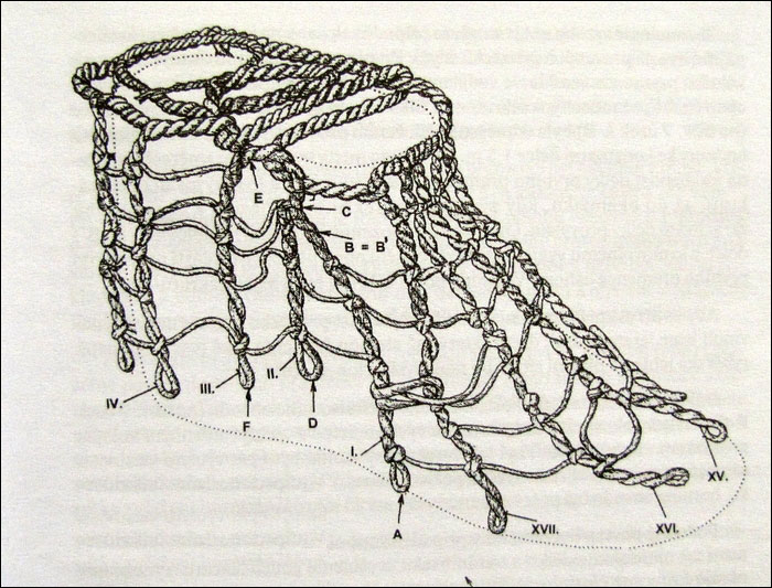 Boty byly opravdu jedinečné. Podrážka z medvědí kůže byla po obvodu prošitá řemínkem z teletiny. Na tento řemínek byla upevněna nejzajímavější část boty, jakýsi ripstop svršek z lýkové sítě s oky asi 2 – 3 cm velkými. Tato síť držela botu bezpečně na noze a zároveň držela izolační vrstvu zmuchlaného sena.