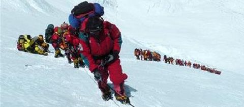 Německý horolezec Ralf Dujmovits měl nejvyšší horu světa nadosah. Kvůli špatnému počasí se však v 8000 metrech rozhodl neriskovat a vydal se směrem dolů. Cestou se mu naskytl absurdní pohled na nekonečnou šňůru asi šesti set dobrodruhů. Šli opačným směrem.