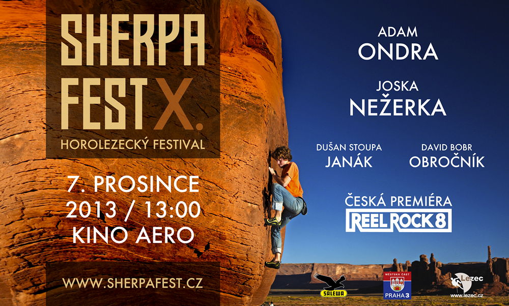 Zveme vás na 10. ročník čistě horolezeckého festivalu Sherpafest 2013. Přijďte v sobotu 7. prosince 2013 od 13:00 do pražského kina Aero! Mimo jiné vás čeká show Adama Ondry a česká premiéra Reel Rock 8!