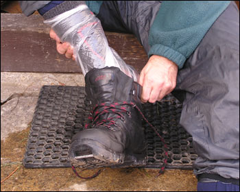 Jedno řešení je použít tzv. protiodpařovací barieru (POB), kterou není žádná věda vytvořit a lze ji i snadno vyzkoušet. Jak tedy funguje? Jejím úkolem je zabránit zvlhnutí bot vnitřní vlhkostí vytvořením pro vodu a vlhký vzduch neprůstupné překážky uvnitř boty. Na nohu si většinou nazouváme nejdříve slabou funkční ponožku která dobře odvádí nadbytečnou vlhkost přímo od nohy, dál pak používáme silnější, tzv. teplejší ponožku, někdo funkční, jiný třeba jen upletenou babičkou. Dál obvykle je už podšívka boty, kožená či látková nebo u teplých bot nějaká termovložka. V každé botě je určitě také vložka, více či méně tvarovaná, která zlepšuje větrání boty a tepelnou izolaci zespodu. Tyto části ovšem chceme zachovat trvale suché po celou dobu našeho pobytu v přírodě. Nejsnadněji dostupnou POB jsou obyčejné větší plastové sáčky na pečivo ze samoobsluhy které si nazujeme přes silné ponožky před obutím do bot. Neprotrhneme-li sáček při obouvání, většinou spolehlivě vydrží neporušen celý den v botách a plní tak dobře funkci POB. Večer se z počátku asi budeme dost divit jak jsou ty silné ponožky vlhké až mokré, ty prostě musíme prozatím vyřadit, bez vysušení je nelze dál použít, ale je snazší mít několik párů náhradních ponožek, než náhradní boty. Boty by takto měly zůstat stále suché a bez problému schopné dalšího použití.
