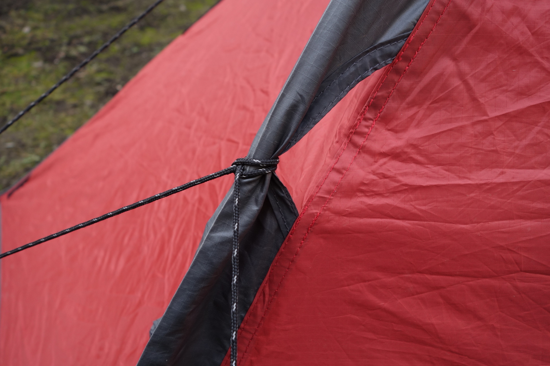 Za chladnějších nocí se i při dostatečném větrání zevnitř na tropiku sráží vydýchaná vlhkost, a pokud není dost vzdálené od vnitřního stanu, můžou navlhnout věci, které se přitisknou až na tropiko (a to nejen u vnitřních stanů ze síťoviny). Delší stěny stanu proto musí být dostatečně vypnuté, aby tropiko neleželo na vnitřním stanu. Jinak můžete ráno mít pěkně vlhký spacák nebo oblečení, které uložíte na noc podél stěny stanu. Na obrázku je tip jak vypnout boční stěnu stanu jedním kolíkem, aby byla co nejvíc vzdálená od vnitřního stanu. Ušetříte tak jeden kolík a ještě tropiko od vnitřního stanu oddálíte na maximum.