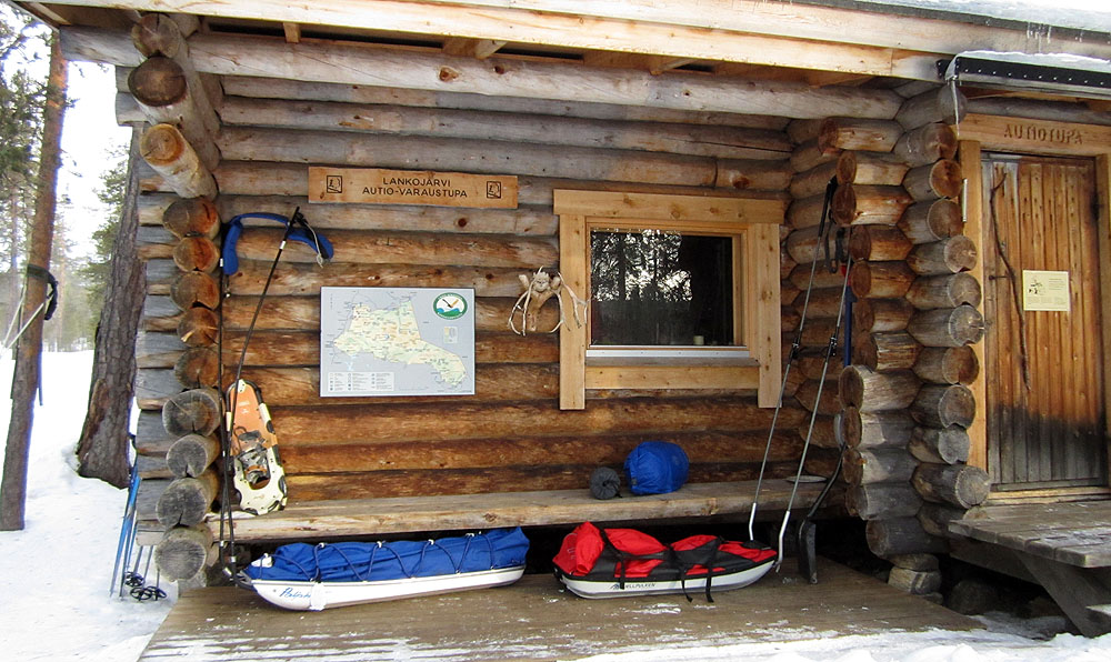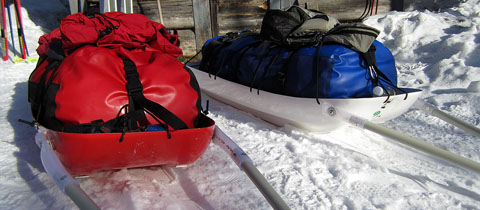 S přenášením mimo sněhovou pokrývku se u skandinávských výrobců nepočítá, domácí většinou dojedou na začátek putování autem se saněmi na střeše a dále pokračují již po sněhu. Saně jsou konstruovány tak, že se balí přímo do nich, vak není vyjímatelný. Při pobytu na chatě se saně nechávají venku. Věci se balí obyvykle do malých pytlů nebo tašek, aby se do chaty nemusela nosit každá jednotlivost zvlášť. Výhodou je dokonalé uzavření, nikam se nedostane sníh.