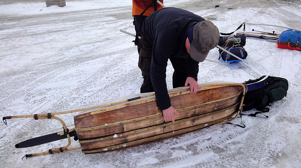 Přejít do galerieRoli hraje rovněž profil dna: ploché dno je sice stabilní, ale klade velký odpor. Nejlépe jedou saně s vyprofilovanými ližinami, v ideálním případě mají ližiny rozchod strojové běžkařské stopy. Naprosto nezbytné jsou pevné tyče, tažení saní/bobů na provaze je možné pouze po rovině nebo do kopce v jednoduchém terénu bez překážek. Ve složitějších podmínkách nebo sjezdech se s takovými saněmi nelze pohybovat. Pokud je tažný systém pevný, musí být i odpružen a mít velmi dobře polstrovaný bederní pás, aby nedošlo k úrazu páteře. Alternativou jsou měkčí tyče připojené gumou, jejichž jedinou nevýhodou je ujíždění saní v traverzu do boku. Nevadí to nijak zásadně.