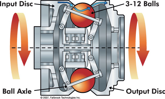 Podívejme se nyní blíže na princip novinky. Ten je zřejmý z obrázku. Jeho kouzlo spočívá ve využití faktu, že se jednotlivé disky stýkají s kuličkami na různém průměru. Jsou-li tedy oba disky rovnoběžné a rovinné, je převodový poměr mezi vstupním a výstupním diskem 1 : 1 – oba se točí toutéž rychlostí. Jakmile ale dojde v důsledku prohnutí disku ke změně průměru, na němž se kuličky stýkají, budou se kuličky dotýkat u jednoho disku na větším průměru a u druhého na menším, čímž se změní převodový poměr. Principiálně je to velmi jednoduché, realizace je ale složitější. Jedná se jak o materiál disků i kuliček, tak o celkovou konstrukci, která musí zajistit dokonalý kontakt kuliček a disků. K činnosti napomáhá speciální kapalina vyvinutá pro tento účel firmou Valvoline.