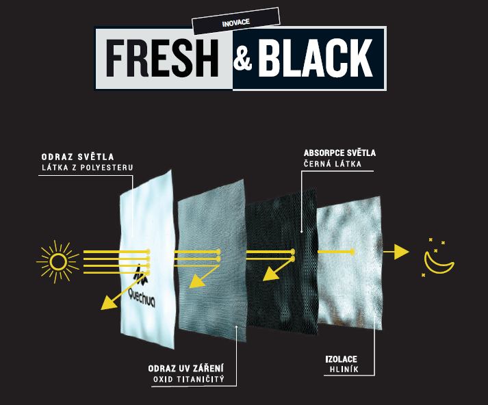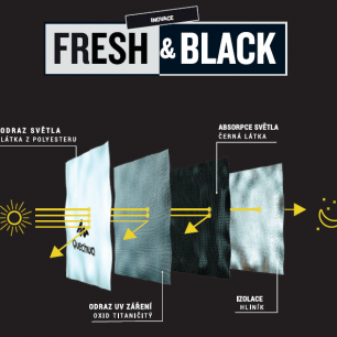 Fresh&Black představuje spojení inovativních materiálů, které přirozeně regulují teplotu a světlo. Vícevrstvá tkanina odráží tepelné záření, čímž dokáže ve stanu razantně snížit teplotu. Na přímém slunci činí tento rozdíl až 17 °C. Nicméně i ve stínu pocítíte rozdíl. Stan je totiž vybaven i perfektním systémem odvětrávání a ventilace. Další výhodou je 99% tma bez ohledu na intenzitu slunečního záření. V létě jistě každý zažil probuzení slunečními paprsky nebo horkem. Díky technologii Fresh&Black si můžete v klidu pospat i přes to, že se slunce už dávno vyhouplo nad obzor.