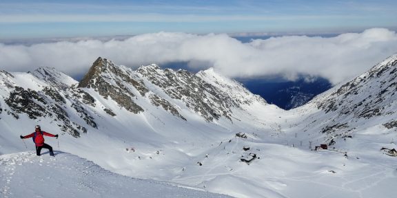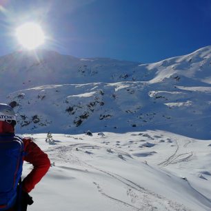 A jak zpět k autu, pokud nechcete platit? Od jezera k dolní stanici lanovky se dá jet taky freeride nebo okružní jízda po cestě. My s ohledem na mlhu, která by se dala krájet, zvolili kombinaci. Tedy širokou kotlinu projet poslepu a místo skalisek s lesem to vzít po magistrále. Při viditelnosti i tohle stojí za to. Túry můžete volit vlastní nebo po značení s ohledem na lavinový stav svahů a počasí.