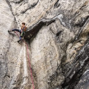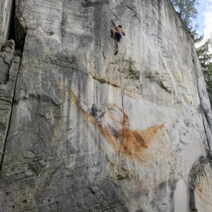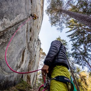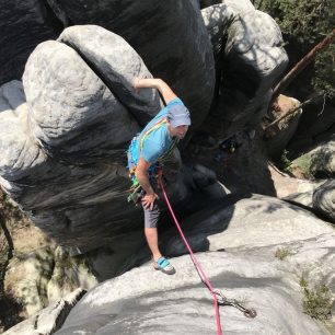 Ale teď zpět do Skaláku, protože i tady zanechal, vy víte kdo, své kruhy. A protože zbožňuju spáry a především prstovky, ulpěl můj zrak na jakési trilogii špekových cest, které jsou všechny za IXc a všechny jsou z velké části prstové. Nešikovné ruce na Šavlovnu, Climbing naprudko na Ministranta a Zeby lekrace na Trůn. Jako do první jsem se pustil do Nešikovných rukou, ty mě nakonec pustily a i jako první na RP. Pak mě rozptylovalo mnoho jiných cest, oblastí a aktivit a bylo furt teplo, takže jsem si nechával těžký cesty na podzim. Najednou byl říjen a já se konečně podíval do Climbingu naprudko. 6 metrů nejištěné prstovky a potom boulder nad kruhem a bouldrový výlez s vřesovým topem. Avšak RP téhle cesty mi unikl o tenký vlásek, když jsem spadl v jedovatém oblém a špinavém výlezu za vřes. To už se chýlil konec října a skály přestaly po ranních mlhách vysychat, takže z trilogie jsem zatím vylezl čistě jen tu jednu. Aspoň se mám na co těšit na jaro!