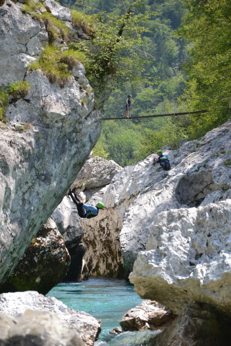 Možností pro kaňoning je v okolí Bovce spousta, ale pravděpodobně nejznámějším a nejvhodnějším místem pro začátečníky je koryto potoka Sušec. Kaňon se dá překonat celý bez slaňování, tedy jen skoky a přírodními skluzavkami. Nikdy jsem si nepřipadal tak moc jako dospělé dítě, je to jedno velké hřiště pro odrostlé. Je fajn s sebou mít zkušeného průvodce, který zná aktuální stav, protože kaňon se každý rok trochu mění.