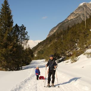 Pokud už vás nebaví jezdit pořád nahoru dolů a máte chuť hory taky trochu „pochodit“, jste na tom jako já. Krom toho bylo ten den nádherně a já zrovna vyzískala dvě malé děti na hlídání. Beru sněžnice, sáňky a speciální zápřah a kupuji si jednu jízdu dvoupatrovou lanovkou ze Samnaun na Alp Trida Sattel (2.488 mnm). Tady nazouvám sněžnice, zapřahuji štěbetající expediční náklad a odvracím se od lyžařské honičky po svazích.