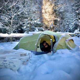 Přejít do galeriePojedeme na Šumavu. Předpověď počasí slibuje den ode dne nižší teploty. Vypadá to, že budeme stanovat v teplotách kolem −20 °C, což naše třísezonní péřáky nemají šanci odizolovat. Rozhodujeme se v praxi ověřit teorii více spacáků. Bavlněná vložka do spacáku, letní pytel a navrch péřák s limitem −8 °C. Doma testujeme, jestli se vejdeme. Je to překvapivě komfortní. Snad to bude i fungovat a neomrznou nám zadky.