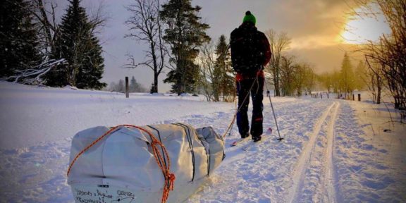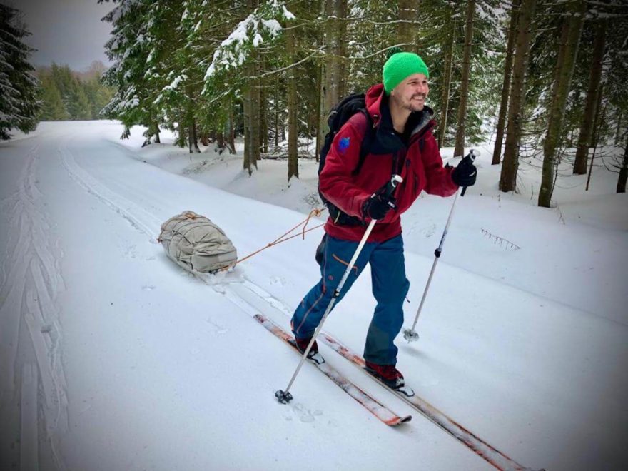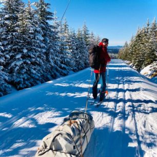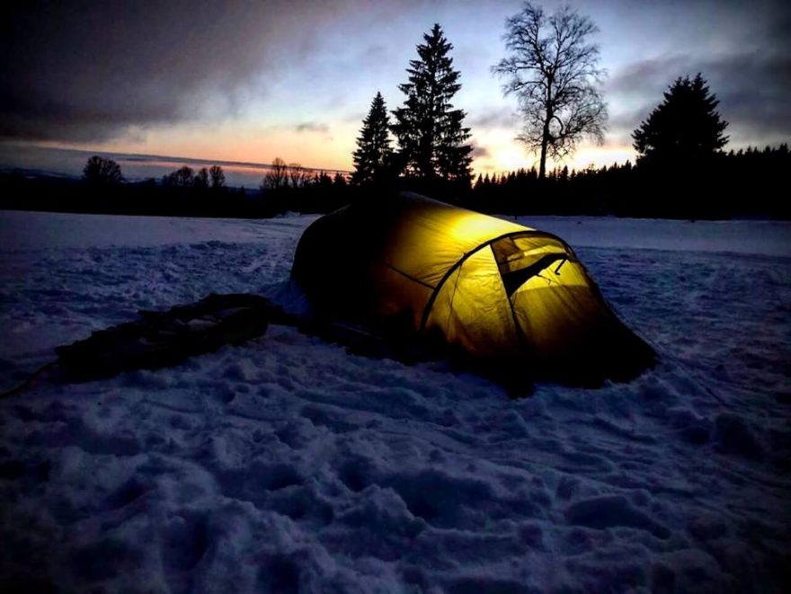 Vlakem jedeme do Nového Údolí. Po téměř pěti hodinách cesty nasazujeme pásy na lyže a vyrážíme. Čeká nás zhruba 75 kilometrů a čtyři noci venku. Počasí je fantastický. Jsme natěšení. Dneska musíme dojít na nocoviště u Strážného. Budeme hodně rádi, pokud to stihneme za světla. Překvapuje nás, jak málo je sněhu. Žádná upravená běžkařská trasa. Naštěstí slušně mrzne a sníh se pod bombami, které mají zhruba 40 kilo, tolik neboří. Jde se nám dobře. Čekají nás poslední dva kilometry. Se soumrakem bychom to měli zvládnout. Omyl. Cesta začíná být rozrytá těžební technikou. Boby táhneme po zmrzlém bahnu a naše tempo rapidně klesá. Musíme nasadit čelovky. Ve tmě míjíme odbočku turistické značky a dál pokračujeme bahnitým korytem. Naštěstí si chybu poměrně brzy uvědomujeme a vracíme se na správnou cestu. I tak nám ale poslední kilometr cesty zabral skoro hodinu. Následuje stavba stanu a večeře. Záhy zalézáme do našeho spacákového trojobalu a usínáme. I když je venku −20 °C, je nám teplo. Dokonce tolik, že můžeme pootevřít stan, aby co nejlíp větral. Čekají nás ještě další tři noci a maximální eliminace vlhkosti je zásadní, abychom to v pohodě zvládli.