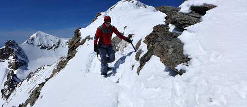 Nejoblíbenější vrchol v oblasti, je samozřejmě i naším cílem. Je první máj, ale sněžilo celou noc a den, a najednou máme půl metru prašanu. Naštěstí pozvolný ledovcový terén a okolní svahy pod 30° nevěští velké lavinové nebezpečí. Trápí nás jen proměnlivá oblačnost. Máme kliku, na kopci se mlha rozplývá.