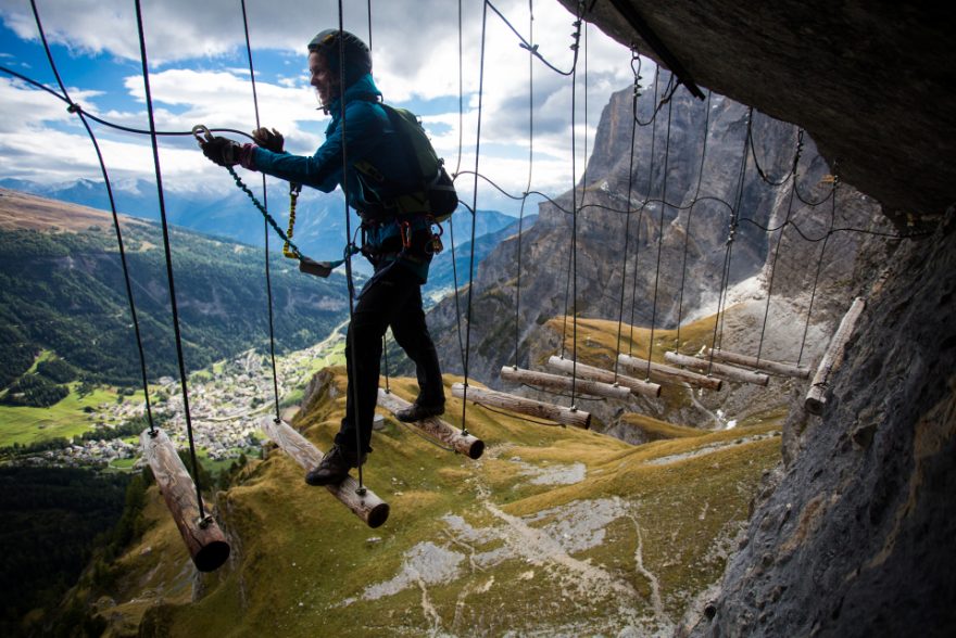 Nejtěžší feratou v celé Itálii je Rino Pisetta (E), vedoucí vzdušnými pasážemi v kolmé stěně nad městečkem Sarche.