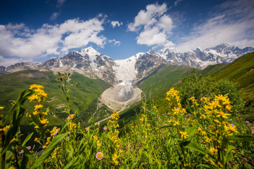 Horní Svanetie získala svůj věhlas díky kamenným opevněným vesnicím, které se krčí pod nejvyššími zaledněnými hřebeny Kavkazu. Napříč Svanetií prochází značený trek, nejdříve vyrážím na jeho méně frekventovanou západní polovinu. Po strmém výšlapu nad Mestii, městečko tvořící centrum oblasti, mě chytá silná letní bouře. Na Kavkaze je potřeba počítat i s dlouhodobějším deštěm. Mělká jezírka Koruldi sice na první pohled dech nevyrazí, nicméně zrcadlící se rozeklaný hřeben hor na jejich hladině je již z pohledu krajinářského vyšší liga. Louky se pyšní plnou rozkvetlostí v sytých barvách.