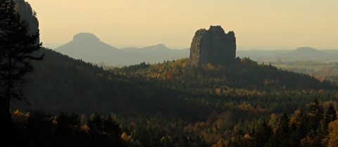 Cesta dále ubíhá podél řeky až Thörwalder brücke, kde uhýbáme doleva, abychom si dali zase trochu do těla. Naštěstí to netrvá dlouho a za chvíli už to sviští z kopce k Zeughaus. Tady opět zamykáme kola a běžíme na vrcholek Grosser Winterbergu. Ten je nejvyšším bodem východní části saského Švýcarska a je odtud pěkný výhled. Samotný kopec je zajímavý snad jen tím, že na něm nejsou skály, což je v tomto kraji pískovců opravdu unikum. Pokud však půjdete po zelené přes Rüchterschlüchte, po červené přes Winterstein nebo si skočíte na vyhlídku Goldstein na modré značce, skal se nabažíte dosyta. Restaurace vznikla v polovině 19. století jako lovecký zámeček a dnes slouží i jako hotýlek s přístupem od Schmilky na břehu Labe.