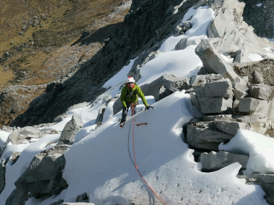 Ve vrcholových partiích jsem na ně nahodil ultralehké hliníkové mačky bez železné vzpěry uprostřed, jen s lankem. No, lezení v měkkých botách s měkkými mačkami nebyl zrovna bůhvíjak velký zážitek, ale zvládlo se to. Boty dostaly zabrat tak jako u někoho jiného za dva roky používání a okopová zóna na špičce se tedy začala trochu odlepovat od Spider framu. Celkově jsem z nich ale měl opravdu radost, zkrátka naprosto univerzální, lehká a komfortní bota i pro náročné lezení, která se v mém botníku zařadila hned vedle mé oblíbené AKU ROCK GTX.