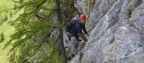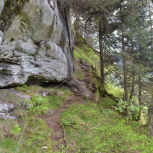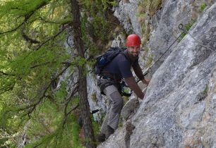 Dnes se vydáte po silnici dále po směru jízdy. Po pár minutách chůze spatříte po levé ruce skalní stěnu s vodopádem vzdálenou asi 1km. Ferata je vedena z levé části skalního masivu směr vodopád. Pokud vás minula modrá šipka se směrem k nástupu, tak nezoufejte, cestu přes louku zvládnete trefit intuitivně a v lesíku při levém okraji skály už na vás čeká jistící lano.