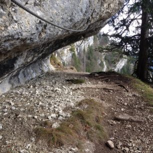 Zajištěná cesta je vedena z větší části po skalní římse, která se zařezává do skalní stěny tak hluboko, že nad sebou vytváří skalní převis. Již od úplného začátku musíte ohýbat svá záda, abyste se vtěsnali do vymezeného prostoru skalním masivem. V předklonu či ve dřepu strávíte tolik času, že touha narovnat se, vás požene celou dobu vpřed.