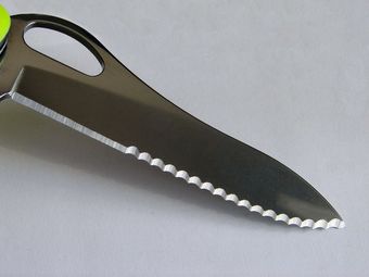 Další čepelí je řezač pásů tvořený 7 cm dlouhým jemně zoubkovaným prohnutým ostřím na začátku a konci ohraničeným vymezovacími zuby. Zoubkování je jemnější s delší roztečí hrotů zubů než u hlavní čepele. Řezání pásů touto čepelí je bezproblémové a i široké automobilové pásy lze přeříznout jedním tahem. Čepel se otvírá za neostrý zobáček na špici čepele, který vystupuje v zavřeném stavu z profilu rukojeti. Otvírání je snadné, možné i s rukavicí. Toto želízko je v otevřené pozici drženo tlakem pružiny na hřbetové straně nože. Zde se zprvu vyskytla jediná vada na kráse jinak povedeného nástroje. U prvního nože, který jsem dostal k testování, byla u tohoto želízka použita nevhodná pružina. Zpočátku pružina ve hřbetu čepel držela ve správné poloze, ale postupem testu při zvýšeném tlaku na čepel pružina začala povolovat a přitom se čepel propadala za osu rukojeti. Po proříznutí pásu se takto předpružená a následně uvolněná čepel vymrštila zpět a měla snahu zavřít se setrvačností. Po konzultaci na základě našeho testu shledal výrobce pružinu jako konstrukčně nevyhovující a majitelům nože s touto problematickou pružinou nabízí výměnu. Victorinox udělal opatření k odstranění problému a aplikoval ho do další výroby. Pro dokončení testu byl dodán nový nůž, kde se díky úpravám v konstrukci pružiny zmíněný problém už nevyskytuje. Je nutno ocenit postup renomovaného výrobce při shledání závady.