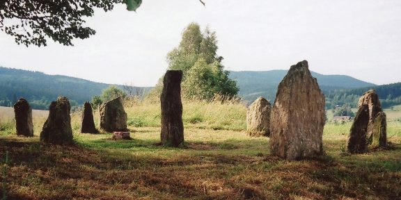 Zdejší Menhiry stály původně v Krušných horách jako součást velkých rondelů, kde však musely ustoupit nejprve scelování půdy, poté stavbě silnice. Díky nadšencům a podpoře města Volary však byly jejich zbytky zachráněny a převezeny na toto místo. Jejich stáří se odhaduje na 8 000 let, jsou tedy svědky časů opravdu pradávných. Nevíme, kdo je opracoval a rozmístil a proč. Mají různý tvar i výšku, od půl metru do asi 130 cm.